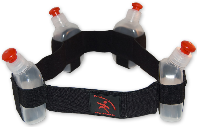 Bälte med fyra flaskor. Flaskorna rymmer tillsammans ca 0,65 l vätska. Det räcker för dig som springer ca 1-1,5 mil.