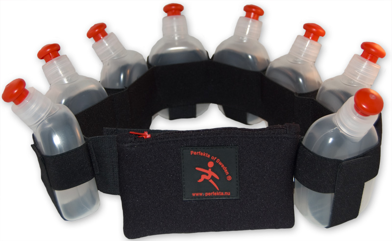 Bälte med åtta flaskor. Rymmer hela 1,3 l vätska. Bra för dig som kör träningspass längre än 2 timmar. Bältet har reflexer på de bakre hållarna och en smidig ficka av neopren på kardborrespännet. Fickan försluts med blixtlås och är fuktavstötande.Finns i storlekarna S, M, L och XL.
