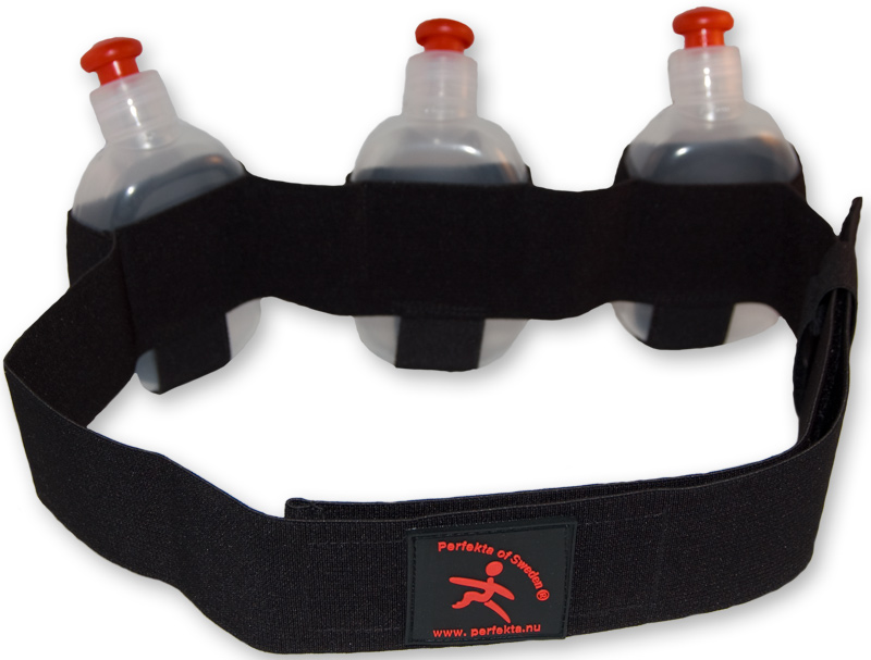 Bälte med tre flaskor. Du får med dig 0,5 l vätska. Lagom att ta med när träningspasset är 6 - 12 km. Bältet finns endast i en storlek men passar alla från S-XL, perfekt för er som vill dela på ett bälte.